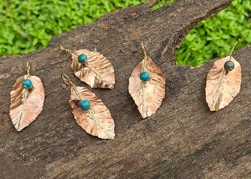 Hand Forged copper leaves with a variety of finishes. Some fire-painted, some with a verdigris patina, and some unfinished. Each leaf has a brass stem and some form of either jasper or Chrysocolla bead accent. One of my favourite things to do with copper, make leaves from every season.