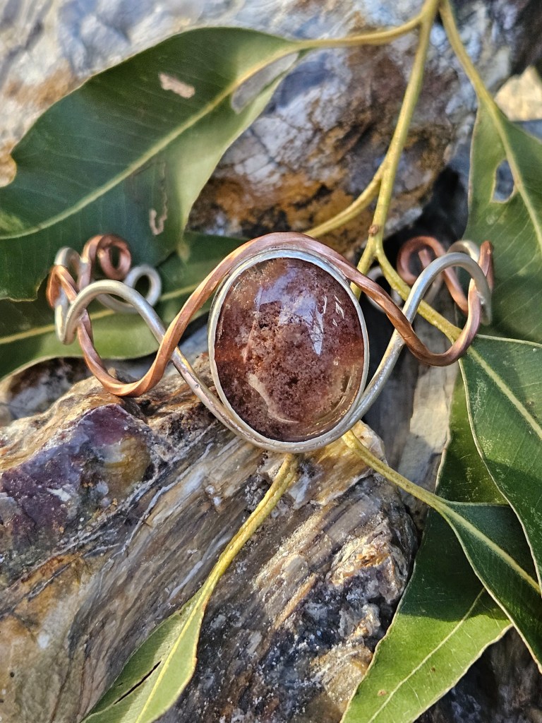 Sterling silver wire and twisted copper wire in an open braid make up the base of this bracelet, while set in the centre is a beautiful Lodite Quartz. It is bezel set in sterling silver with an open back, so that you can really appreciate the hidden world within. An explosion of mineral can be seen in the crystal clear quartz. It reminds me of lazy summer days, looking up at the clouds, and imagining different shapes and places. This is a stone for dreamers.