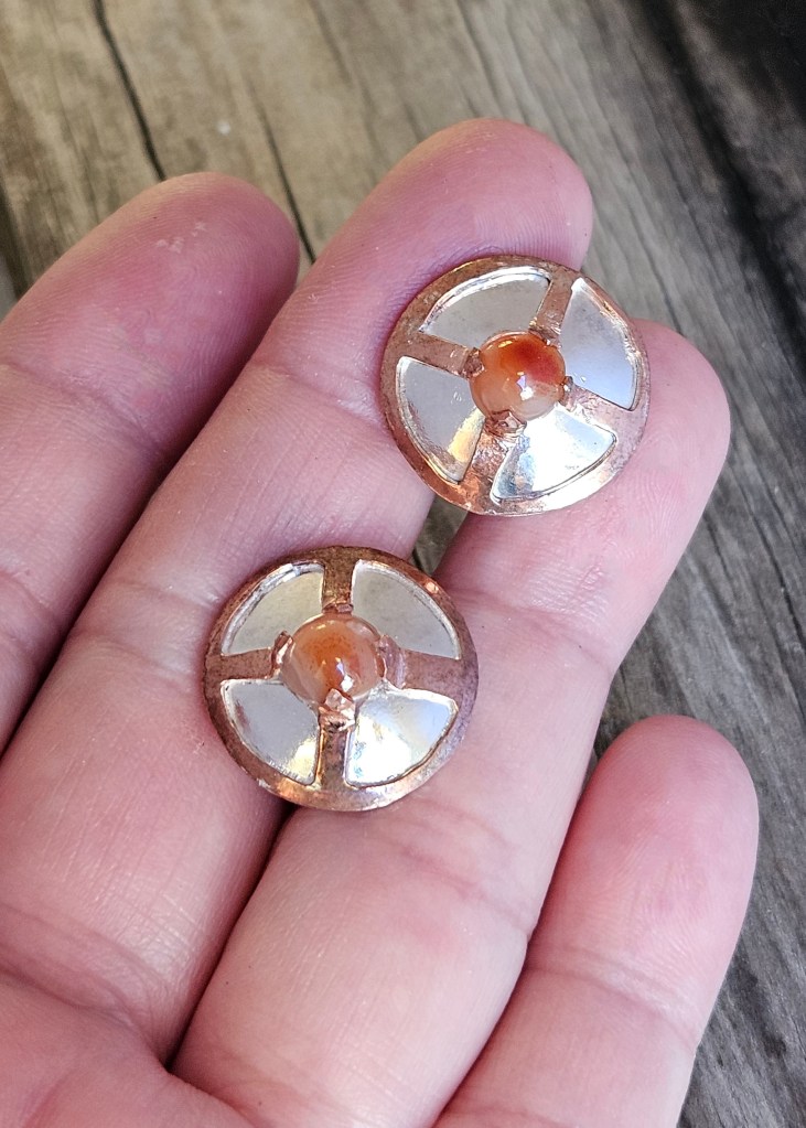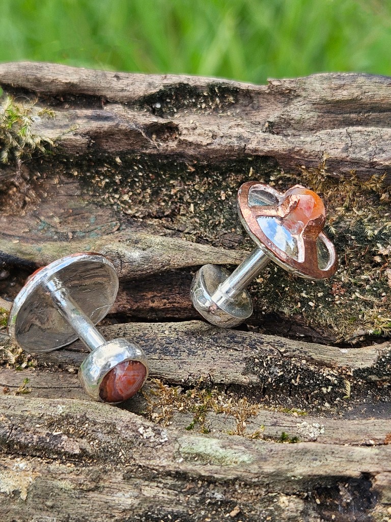 Hand fabricated from sterling silver and copper, these cufflinks have an agate shield boss as well as an agate backside. These agates are a little touch of home, collected from the shores of Lake Superior and shaped by a local lapidist.