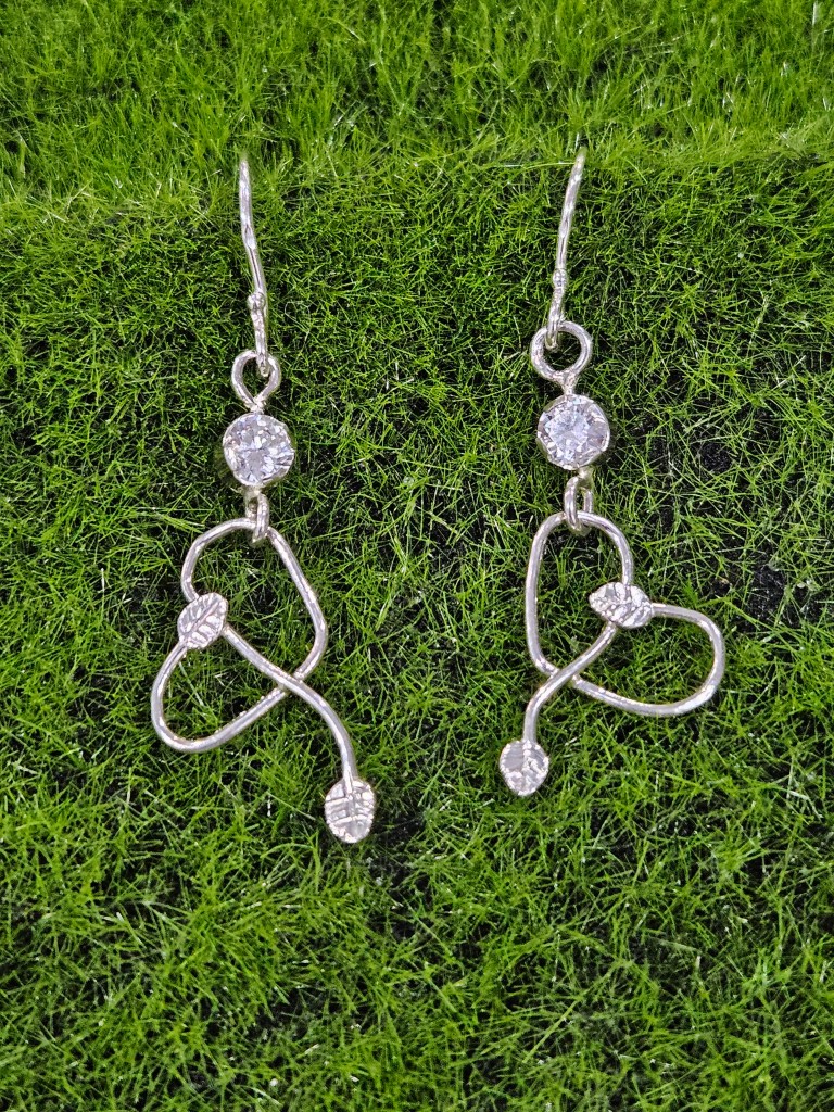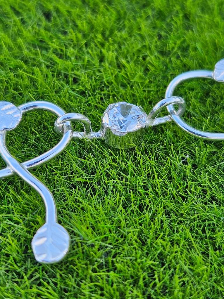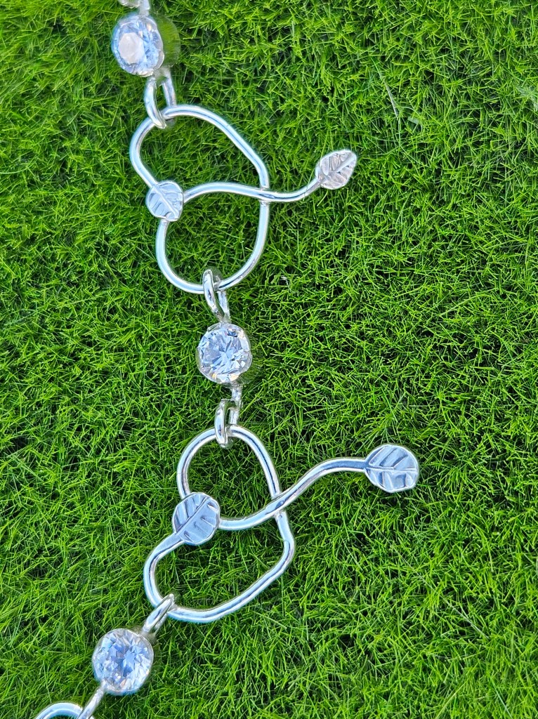 Made of sterling silver wire and sterling silver chenier set with ‘Hearts and Arrows’ clear cubic zirconia. Silver vines twisted into heart shapes with sparkling jewels joining them together to form this collar.